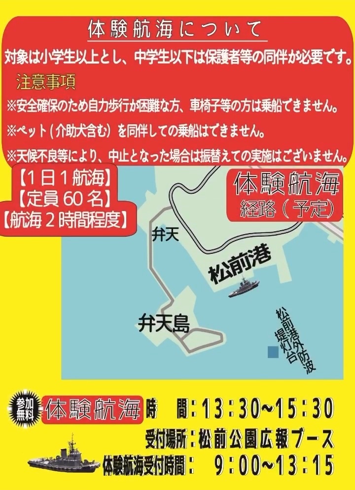 - 体験航海に参加されたい方は、当日に、岸壁 又は「松前公園本丸広場」の自衛隊展示用ブースで受付を行います。
