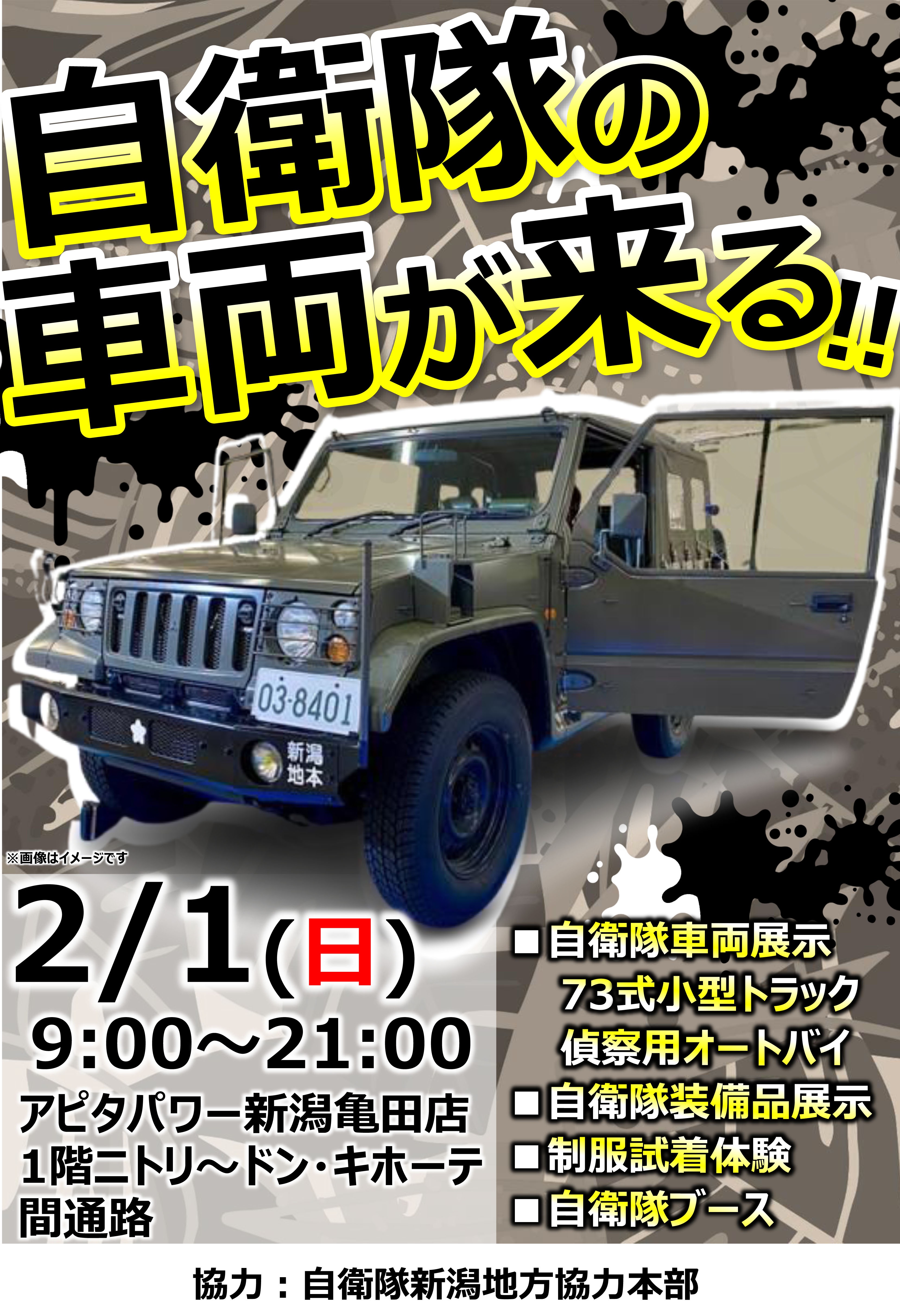 2026年2月1日(日)に、新潟県 新潟市 江南区にある アピタ新潟亀田店で、新潟地方協力本部による自衛隊広報展示イベントが開催されます。