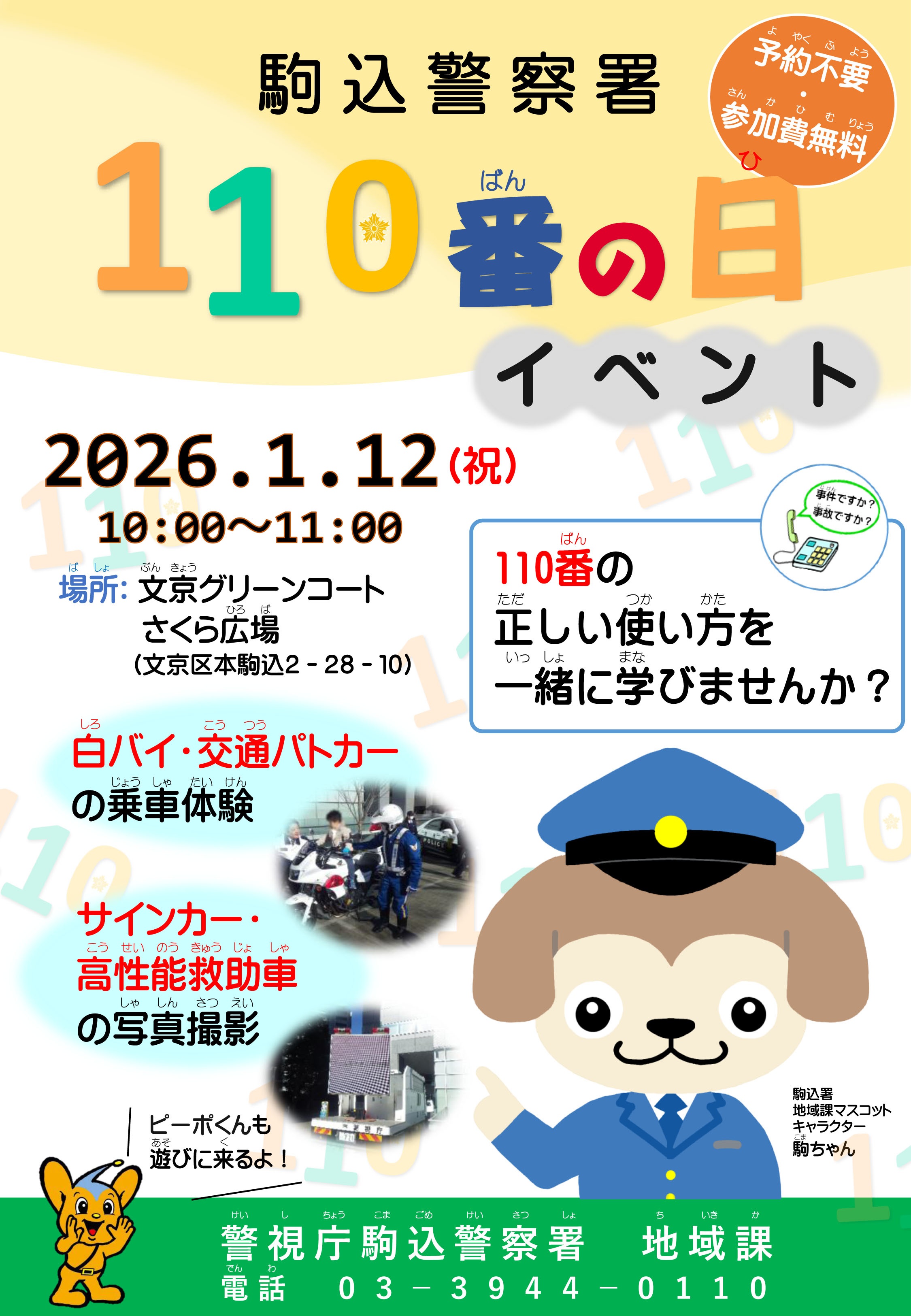 2026年1月12日(月・祝)に、東京都 文京区 本駒込にある 文京グリーンコート さくら広場で「110番の日イベント2026 in 文京グリーンコート」が開催されます。