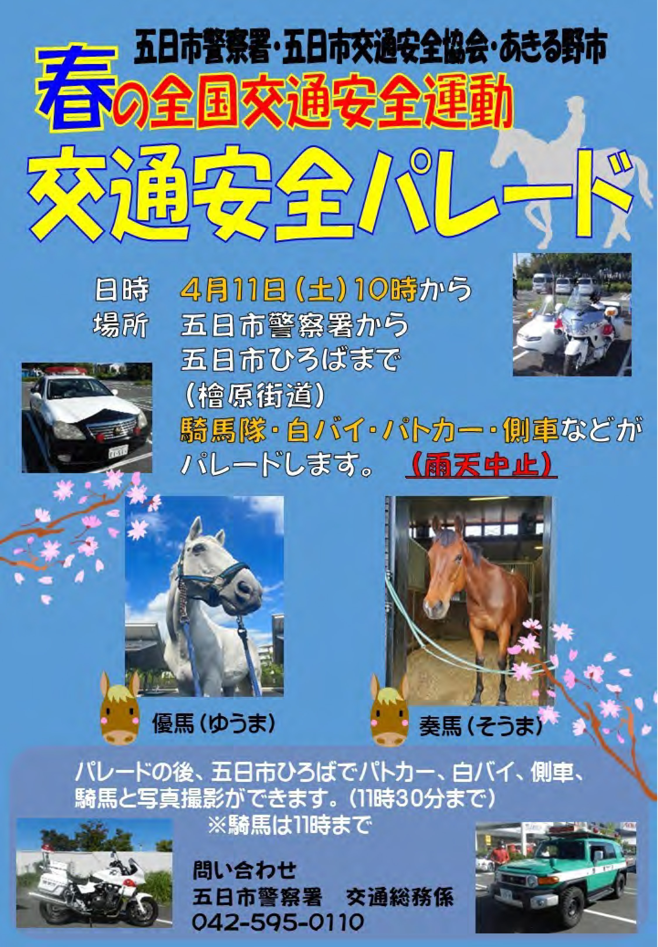 警視庁 五日市警察署 の主催により、交通安全パレードや警察車両展示等が行われます。