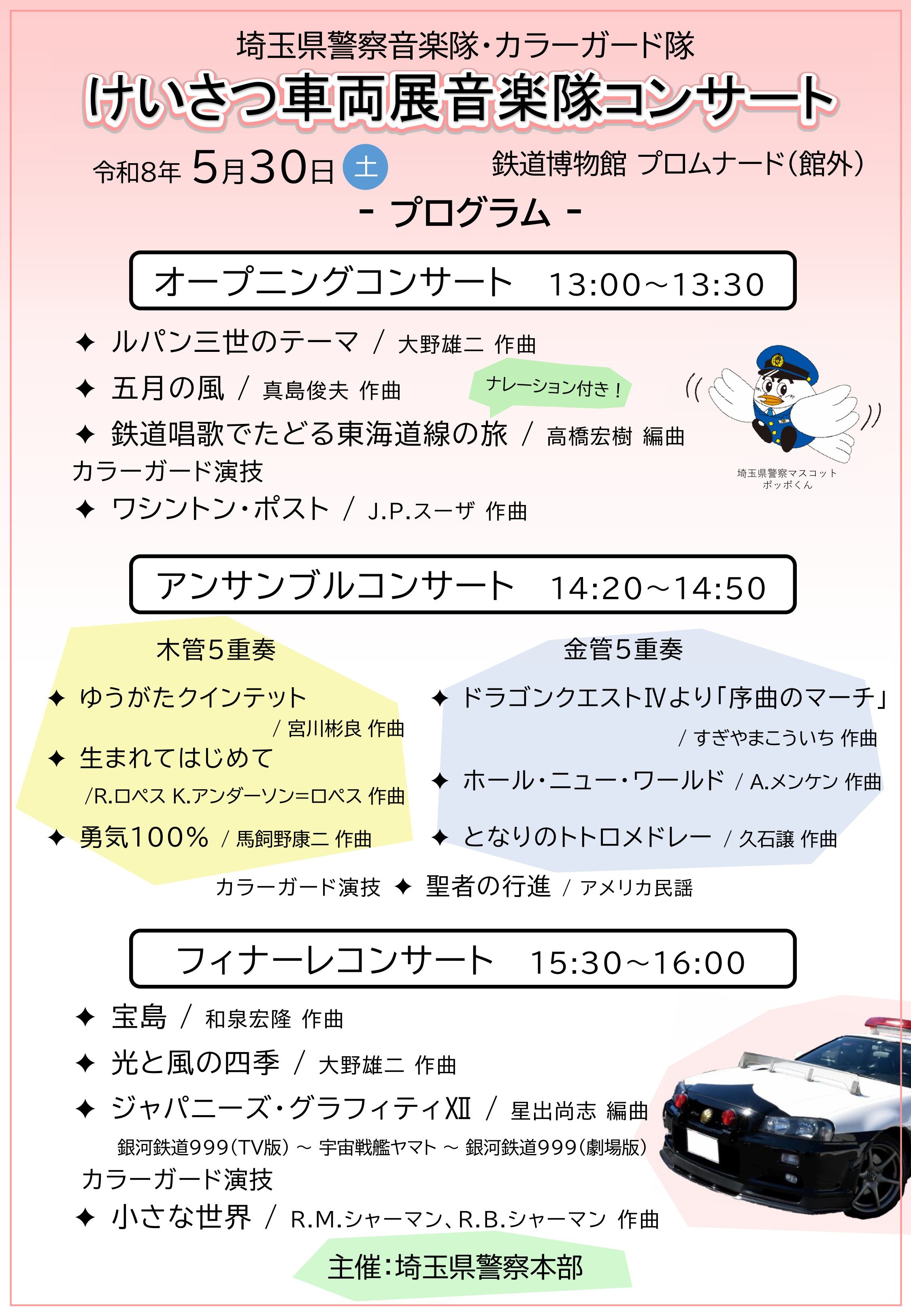 GT-R・RX-7・ランドクルーザー等の警察車両展示、埼玉県警察音楽隊コンサート、警察犬実演、啓発ブースなどが行われますので、是非ご来場ください。